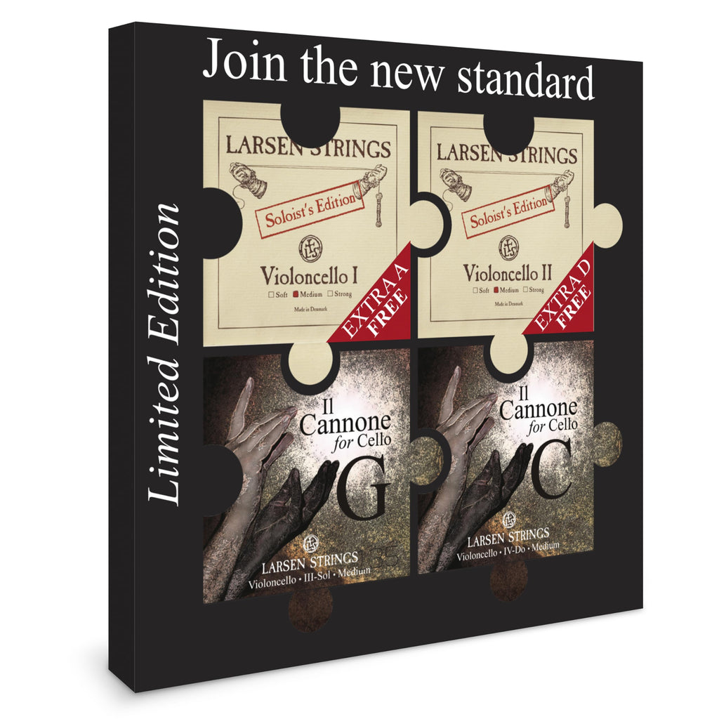 - Professional 4/4 Cello String Set with 2 A-strings and 2 D-strings – Medium Tension - For cellists who have long trusted the Larsen Soloist A & D, but want to taste the power of Il Cannone G and C-strings.